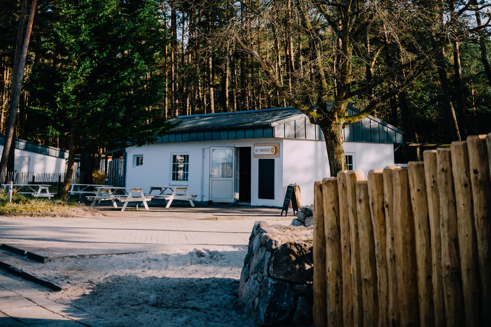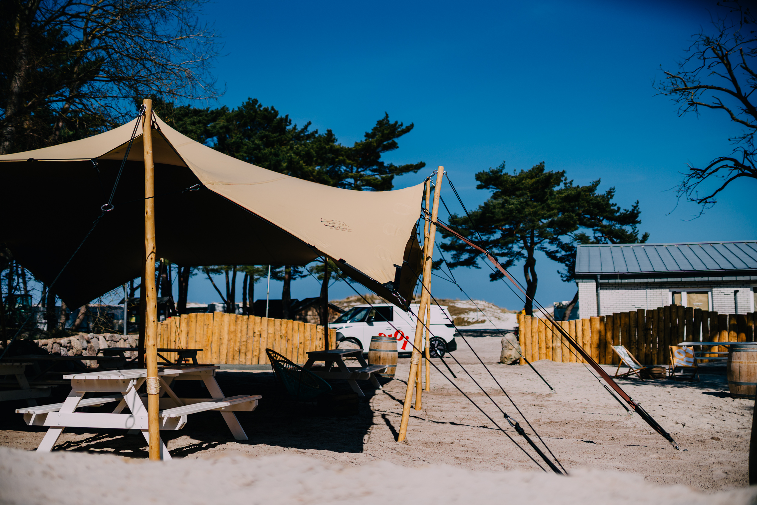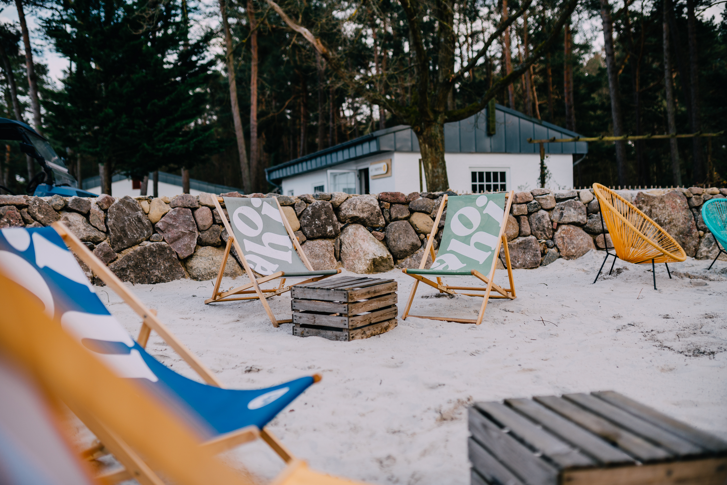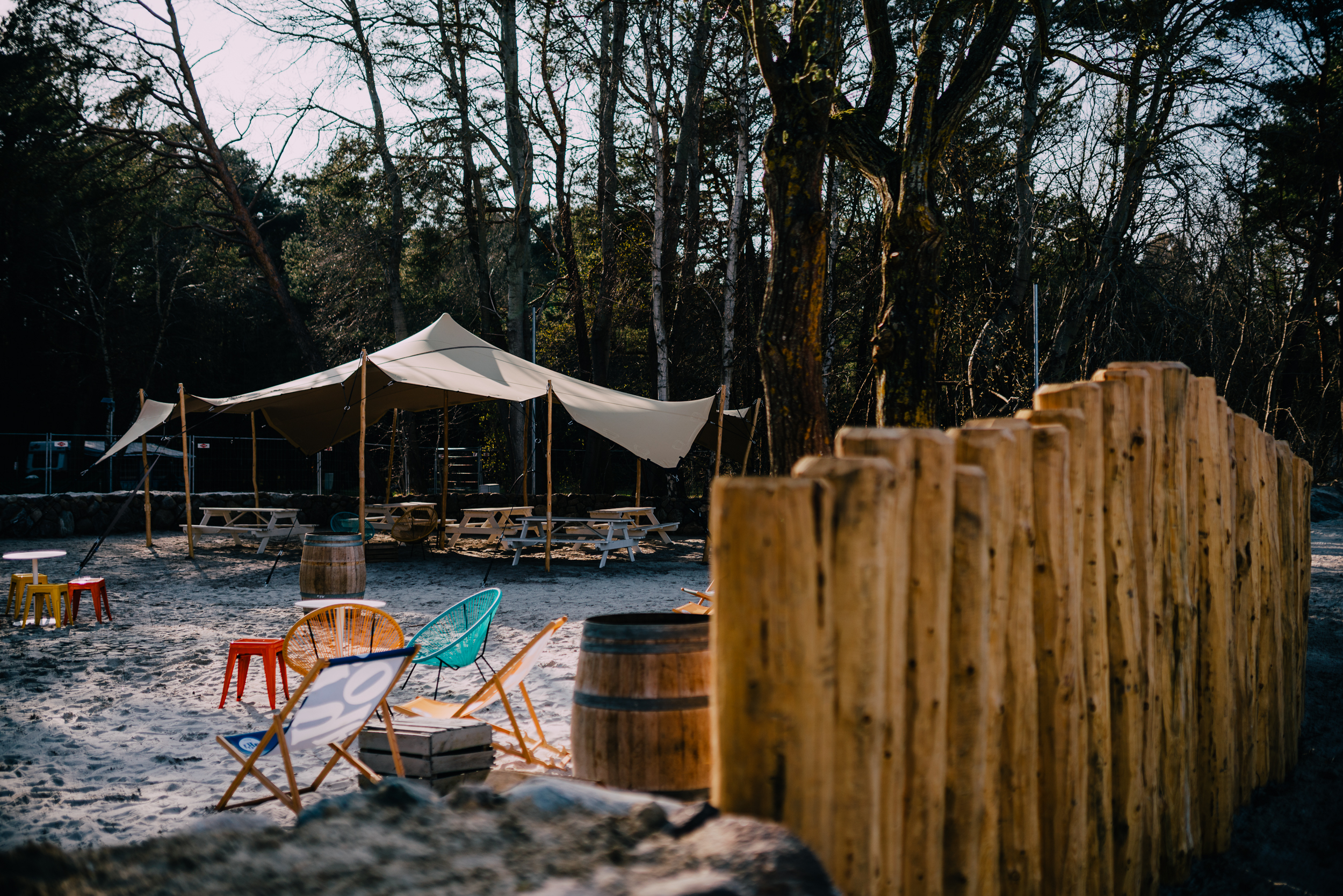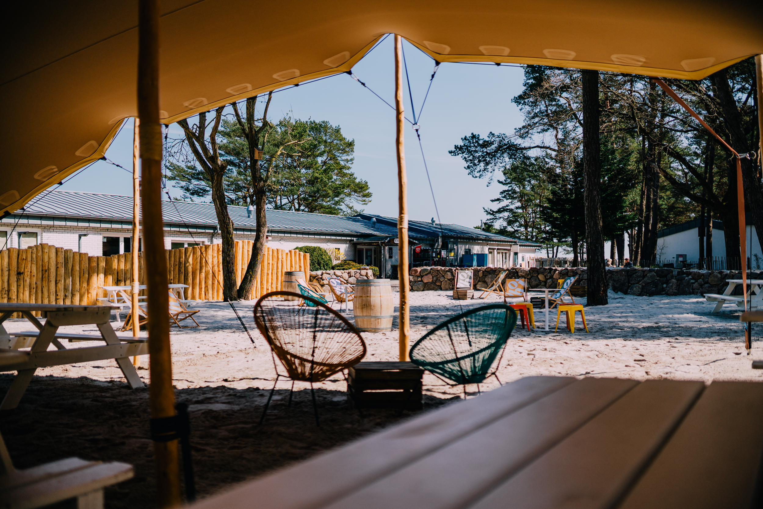 Im Zentrum haben wir eine neue Begegnungsstätte mit Strandatmosphäre geschaffen. Ausgestattet mit einem großen Sonnensegel, Picknickbänken und Liegestühlen, dient das Areal als zentraler Treffpunkt für Gäste und Tagesbesucher.