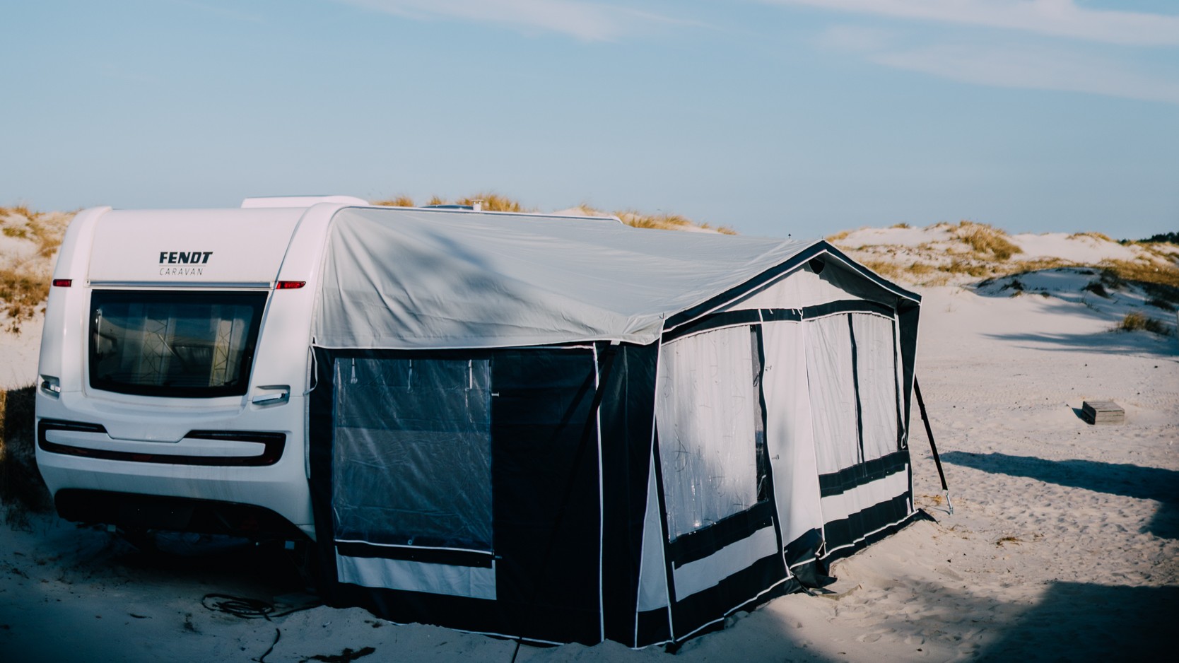 Für Gäste ohne eigenes Fahrzeug wurde das Übernachtungsangebot mit Mietwohnwagen mit Vorzelt und komfortablen Mietzelten in Dünenlage mit Meerblick erweitert. Highlight bleibt natürlich, sich per Traktor mit seinem eigenen Wohnwagen auf einen Stellplatz im Dünental ziehen zu lassen.